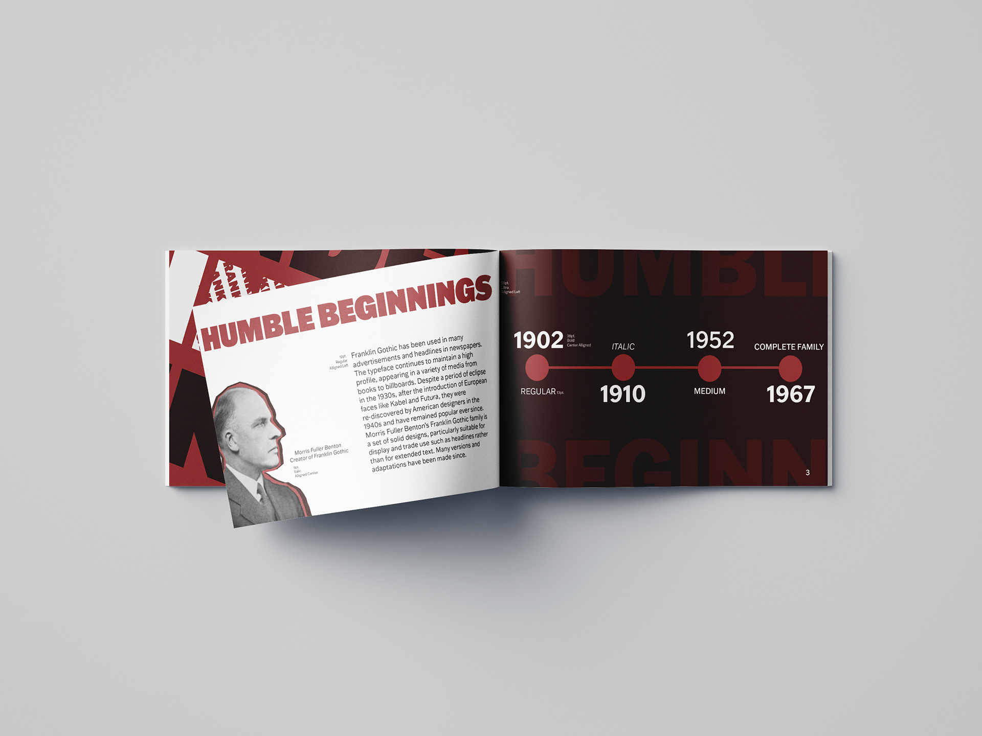 The timeline shows the stages of the font throughout time, it's additions and its changes. I also featured an image of Morris Fuller Benton the creator of Franklin Gothic.